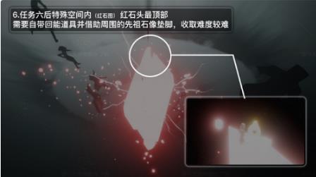 7、任务六后特殊空间里,红石头最顶部。
