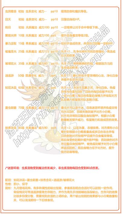 3、简析:九月登场花神。有多种属性的输出技能,参赛系别组合合适时可以起到一定作用,常规情况可带逍遥游提高生存能力,并作为高先手技能辅助连段输出。生存向的效果比较多但很分散,需要找到合适的上场机会。两个输出技能的效果都与小白菊数量相关,可以浅浅期待一下后续表现。