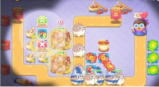 1、第一波开始的时候在右中位置放一个鞭炮,直接升级满级,鞭炮攻击范围大,可以打周围一圈障碍物,之后在右下角建立一个瓶子炮,瓶子炮先打附近障碍物,有金币可以升级瓶子炮,兔子出来的时候先打兔子。