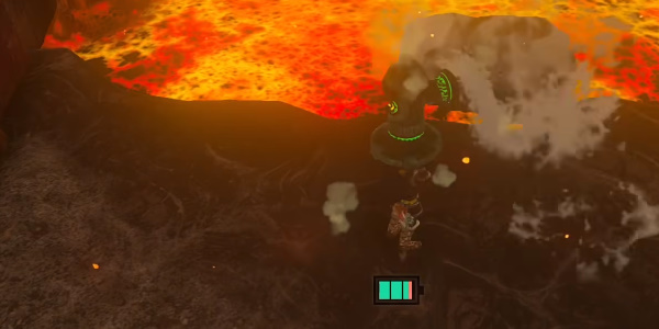 2、跳过岩浆可以看到一个水阀,激活后将它放置到头顶,让水流倒入岩浆中生成台阶。