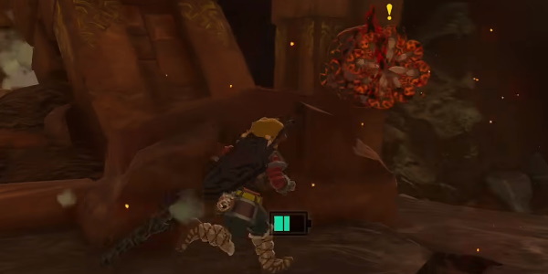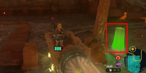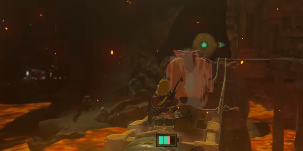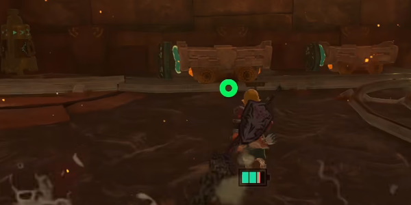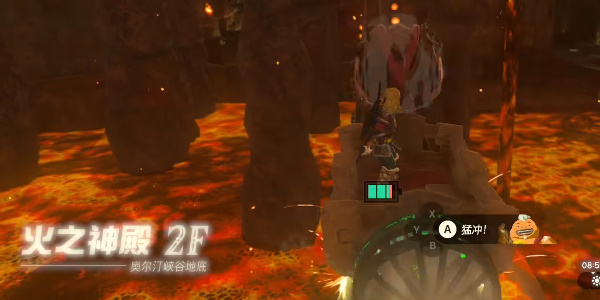 7、我们回到刚才小车停车的位置,然后攻击右侧的机关可以放行,然后我们启动轨道车就能前往火之神殿2F。