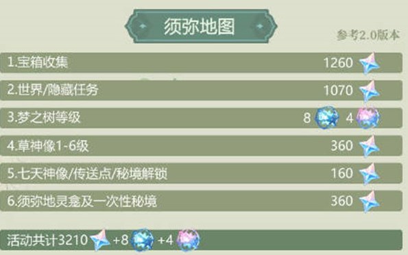 须弥地图可以获得3210原石,其中宝箱收集获得1260,世界隐藏任务1070,梦之树等级可以获得抽奖次数,七天神像解锁获得160,地灵龛一次性的东西可以获得360