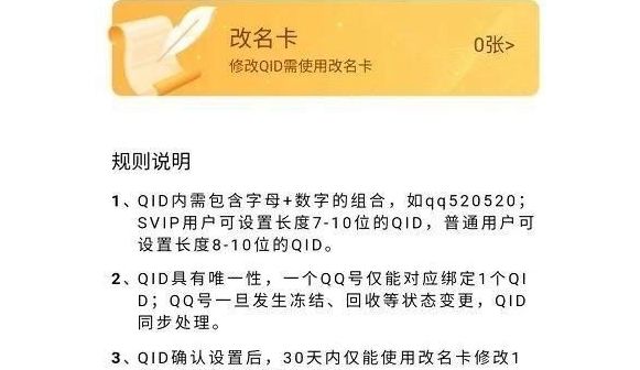 4、QID 确认设置后 , 30 天内仅能使用改名卡修改 1 次,非 SVIP 用户不可修改。