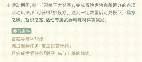 完成魔神任务「离岛逃离计划」、世界任务「骰子、猫与卡牌的战场」、魔神任务「虚空鼓动,劫火高扬」
