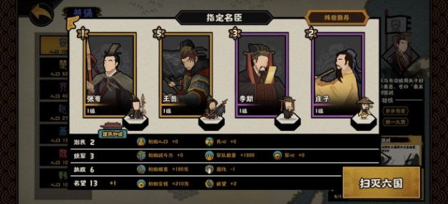 评价:50%的军规外加每次胜利额外增加5的攻占进度,施行该政策也不需要额外的特殊资源。唯一的缺点就是兵甲到10万,兵甲的数量上升带来的就是钱粮的消耗。所以闪电战是王翦的最优套路,兵甲随着战斗会逐渐减少,募兵成了必做的选择题,行动力也是重中之重,所以王翦最好搭配张骞使用。