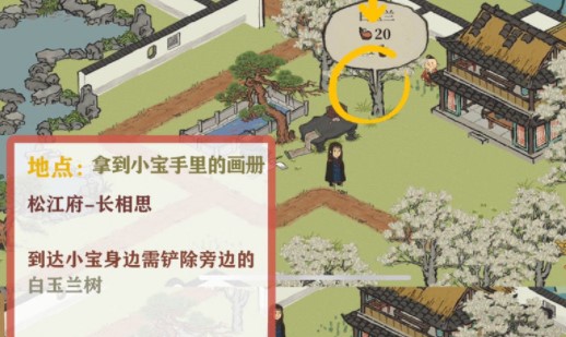 拿到小宝手中的画册,到达小宝身边与其对话,需先铲除旁边的白玉兰树