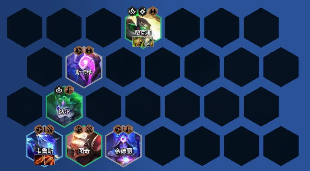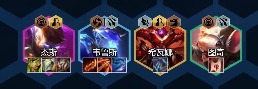 而杰斯、希瓦娜、纳尔这3枚棋子的技能都是范围一次性控制,可形成有效控制链,给我们后排输出棋子争取到非常优质的输出环境,让韦鲁斯可安稳叠加攻速。