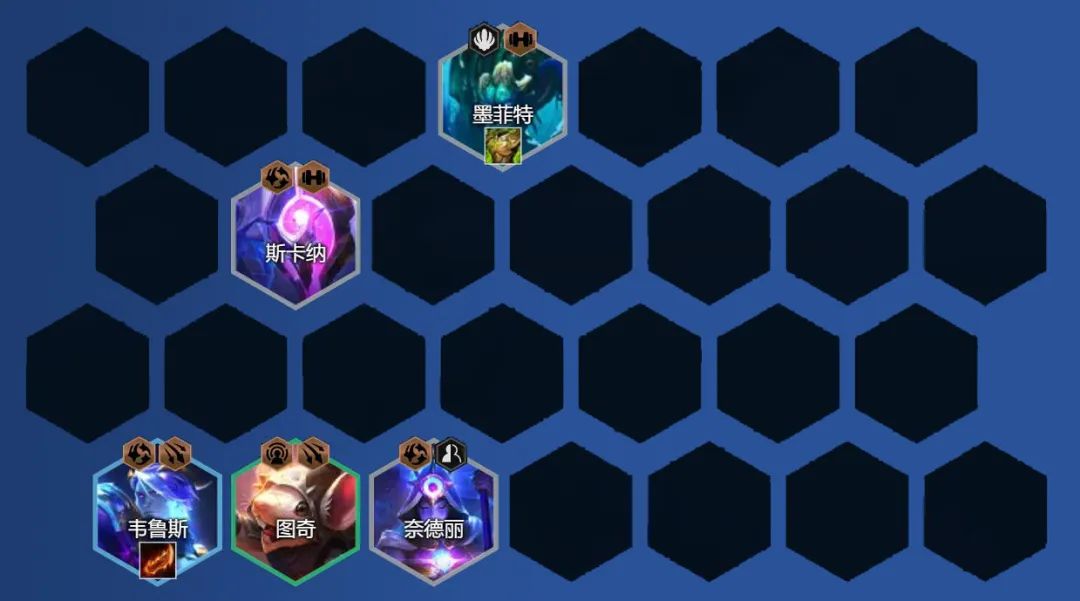 3-2升6人口,打工阵容看自身情况选择有韦鲁斯可考虑添加纳尔开2换形,贾克斯2星可换下莫菲特坦度会更高,如果这时候没有韦鲁斯可看情况上4枚星界棋子,凑7-9星增加韦鲁斯获得的概率。装备上继续韦鲁斯的鬼索与飓风,前排考虑狂徒与石像鬼。