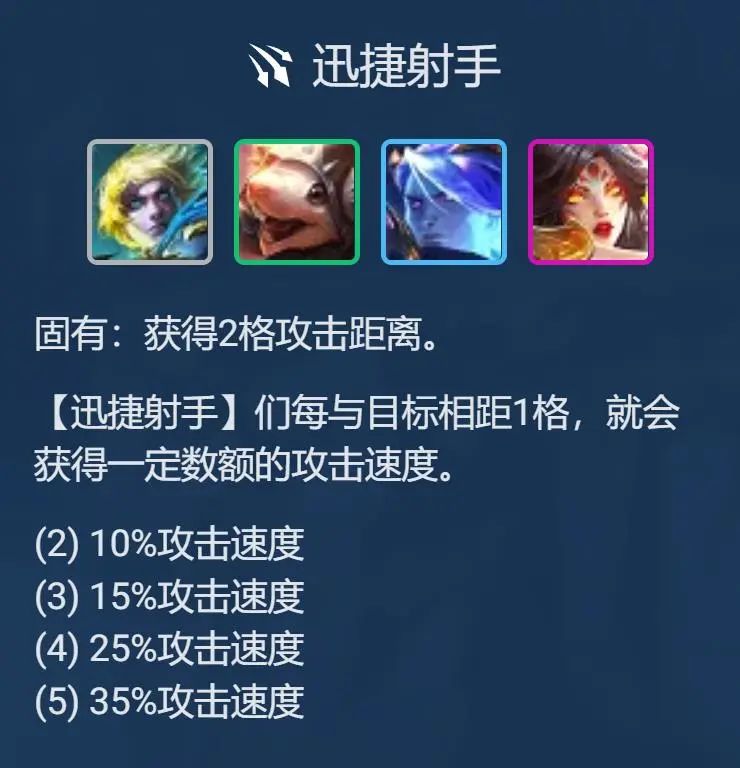 射手羁绊这赛季变为2/3/4/5,特别是多出了3羁绊与铲子能合成射手转职(铲子+)。