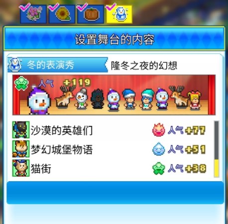 吉祥物可以在剧场里上演表演秀,表演秀可以获取不同种类的情绪,同一个表演秀在不同季节获取的情绪数量不同。