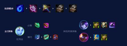主C拉克丝的青龙刀是必备的,其余两件套看情况选择,常规的“无尽配法爆”或是“巨杀配帽子”都可以,具备足够的秒脆皮的能力,而且后期可以换给索尔。塞拉斯需要在前排单顶,做传送门性价比最高,其次是龙牙和板甲。至于杰斯核心必备一件大天使,其余捡垃圾出半肉,最好还有窃贼手套可以安排给3星的吸血鬼或者蝎子。