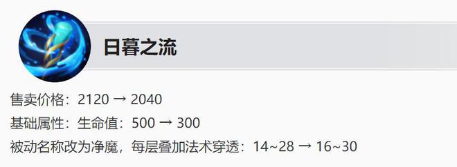 除了英雄技能加强之外,本赛季对于法术装的调整也使得芈月变相加强,尤其是日暮之流的更改,售卖价格减少了80金币,而法术穿透却进行增加,每层叠加法术穿透都增加了两点,这使得芈月在前中期出这件装备性价比极高,可以快速拥有伤害与穿透。