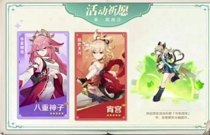 3.7上半卡池角色:宵宫+八重神子+绮良良,武器池:飞雷之弦震+神乐之真意