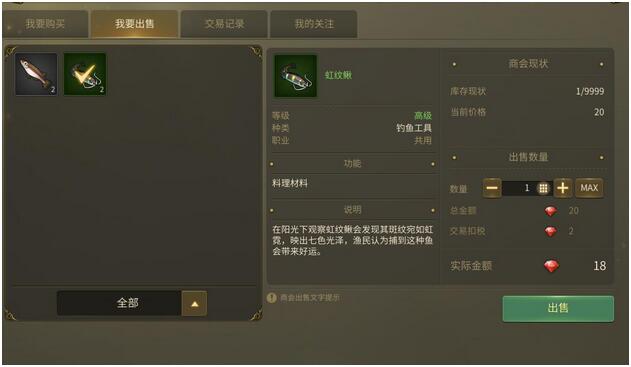当然,玩家们也可以通过商会来赚取红钻,在我要出售板块,玩家可以把自己获得的东西卖掉,从而得到红钻收入。比如下图中,玩家通过鱼饵所掉的鱼就可以被出售,一条可以获