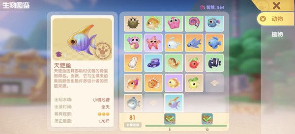 目前螃蟹 白萝卜鱼 黄金锦鲤 气泡河豚 银鲳 都用中级鱼饵钓到了,天使鱼似乎比较稀有,但是也是全天出现的。