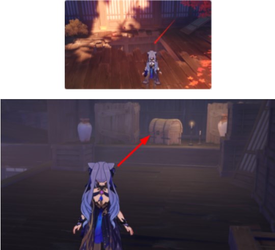 3、拿到第一个宝箱之后,继续跳下去,就可以在拉闸机关对面位置看到第二个宝箱了,只需要打开机关,然后等爬梯下降,然后从机关往箭头方向绕过去就可以拿到宝箱了。