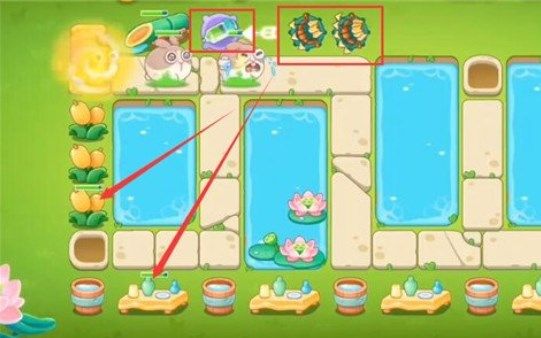 2、3-4波的主要目的就是打掉荷花道具,在荷叶上方多重箭,毕竟这个地图上大部分地方都是水池,只能在荷叶上放炮塔。