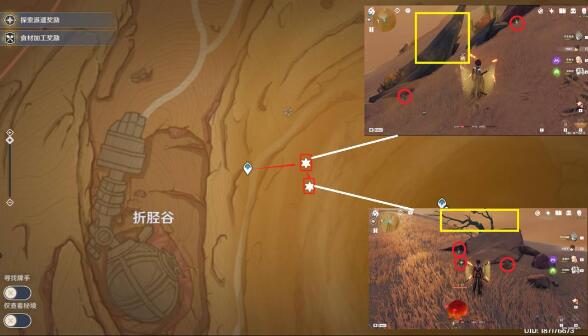 说明:传送到秘境点,向南走到图示位置即可采集,此处无需下落,绕过洞口即可。此处采集完无需重新传送。