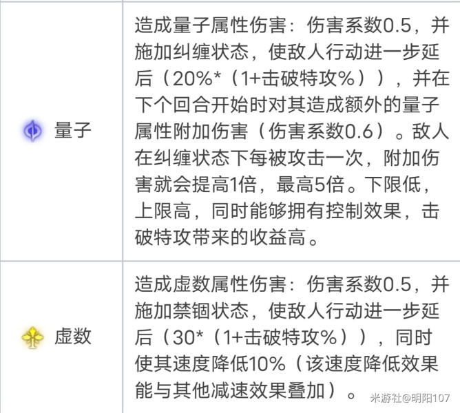 而量子和虚数,则会分别追加(20%*1+击破特攻系数%)以及(30%*1+击破特攻系数%)。
