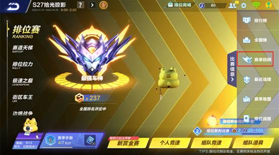 本赛季更新后,车手们可以通过排位【赛季回顾】功能,查看当前赛季和过往赛季自己的表现如何。
