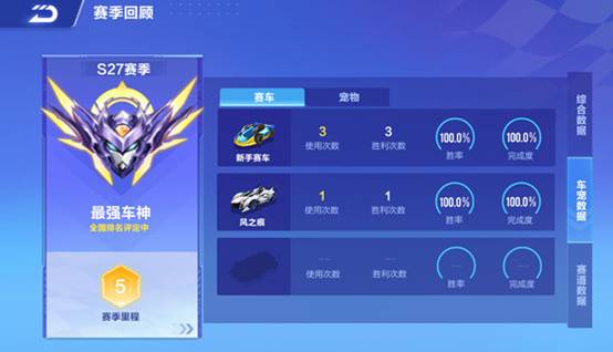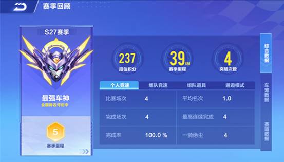 赛季回顾中会记录车手每个赛季的最高段位、全国排名、最高里程等级,以及各个模式的参与数据。