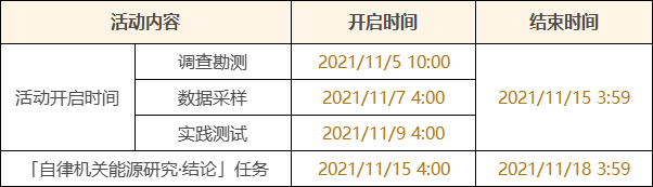 ●活动结束后,完成了「实践测试」中“击败「遗迹重机特异体」”任务的旅行者,可以接取「自律机关能源研究?结论」任务,完成任务可获得奖励。