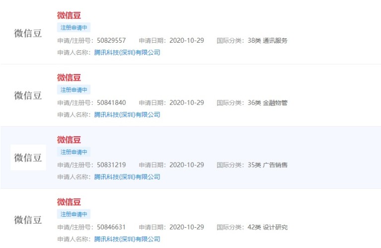 2、腾讯科技(深圳)有限公司注册申请了多条“微信豆”商标,商标申请时间均为2020年10月29日,国际分类涉及金融物管、广告销售、通讯服务、设计研究等。