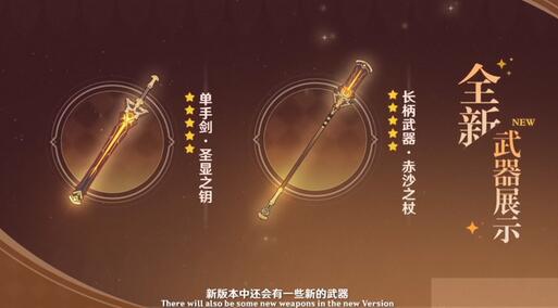 武器卡池:新的5星角色自然会有新武器了,一把是妮露的圣显之钥,一把是赛诺的赤沙之杖,颜色都是金闪闪的很好看,虽然跟他们的服饰不是很搭。