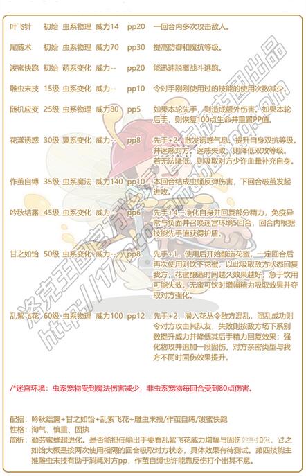 3、简析:勤劳蜜蜂超进化。是否能担任输出手要看乱絮飞花威力增幅与固伤效果如何。甘之如饴大概是按两次使用相隔的回合吸取对方状态,具体效果有待测试。第四技能主推雕虫末技有助于消耗对方pp,作茧自缚也许能靠反伤打个出其不意。