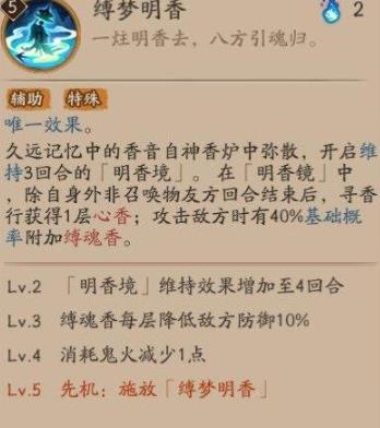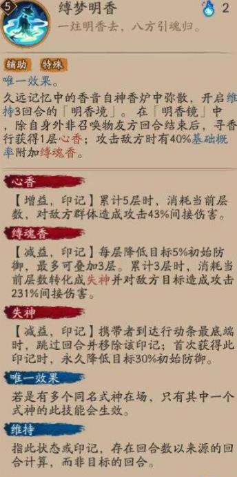 久远记忆中的香音自神香炉中弥散,开启维持3回合的「明香境」。在「明香镜」中,除自身外非召唤物友方回合结束后,寻香行获得1层心香;攻击敌方时有40%基础概率附加缚魂香。