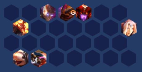 4-5升八人口,卡利息搜三星呲呲,大家可以根据牌库进行选择,正常情况下八级是可以补巴德开七冒险家的,当然了也可以选择补霞开怒翼射手; 三星呲呲后上九人口,优先补希瓦娜开怒翼换形即可,如果没有希瓦娜也可以补霞+索拉卡/亚索