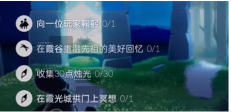 前往霞谷地图,首先来到飞行赛道,拱门上面的平台就是冥想的位置了,坐在光圈中,之后会跳出给大家分享下祝福,随便留言什么内容都行,玩家留言好后就可以完成任务了。