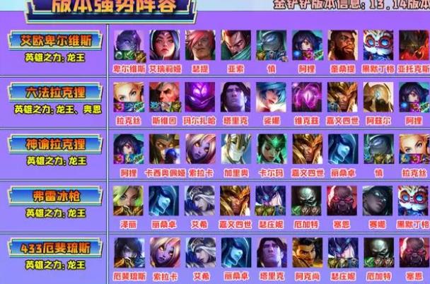 这个版本由于英雄之力龙王的强势和五费卡的技能优化,很多后期发力的阵容大放异彩。如6/8法拉克狸,6神谕拉克狸、九五至尊、艾欧卑尔维斯等都是后期的天花板阵容。