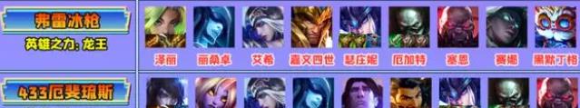 版本最强挂件弗雷尔卓德也衍生出了很多强力吃分阵容,如弗雷冰枪、433厄斐琉斯。这两个阵容的玩法与出装都非常相似,虽然弗雷冰枪上限要比433厄斐琉斯要高,但内卷的人比较多,后期可以根据同行判断具体玩哪套,吃分更简单。