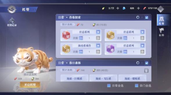 玩家可以在右下角的托管按钮中选择自己想托管的副本进行托管。也就是说不需要玩家亲自动手去刷,系统会自动帮你去刷图,获得奖励,会节省玩家的很多时间和精力。