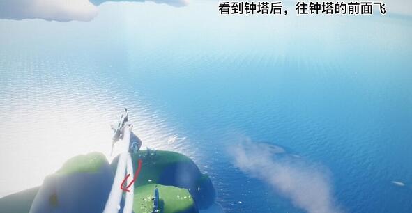 2、接着就会看到钟塔,这时向着钟塔的前面飞。