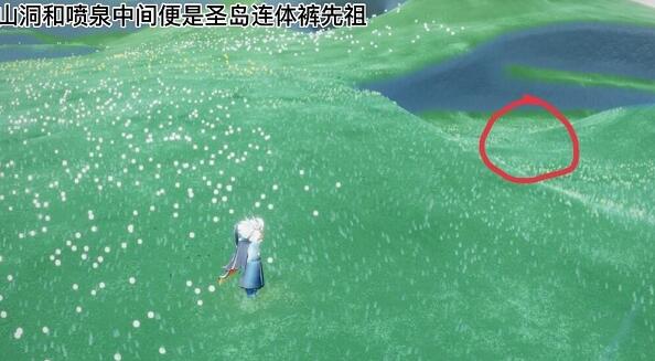 3、最后在山洞口和喷泉中间的位置处就可以找到连体裤先祖了。
