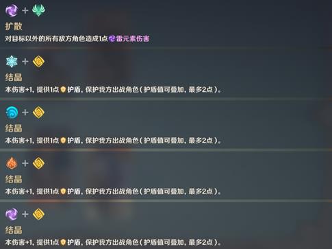 效果:水晶适合火、水、雷、冰元素的附着。大世界没有水晶元素的护盾。这个效果可以立刻为你提供1盾值,可以用来减少对手造成的伤害。当你受到伤害时,护盾值会降低。