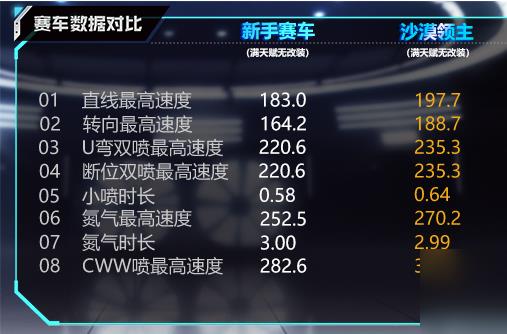 从赛车的六维性能图可以看出,沙漠领主的转向和耐撞能力极为优秀,这使得他在比赛中车头转向更容易调整的同时赛车受撞击影响更小。