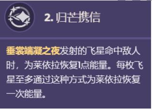 垂裳端凝之夜发射的飞星命中敌人时,为莱依拉恢复1点能量。每枚飞星至多通过这种方式为莱依拉恢复一次能量。