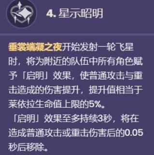 垂裳端凝之夜开始发射一轮飞星时,将为附近的队伍中所有角色赋予「启明」效果,使普通攻击与重击造成的伤害提升,提升值相当于莱依拉生命值上限的5%。