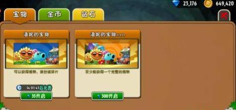 2.潘妮的宝物:在右上角的商店里,有两种宝物的购买方式,一种是每天可免费开启一次,而另一种是用300钻石开十次,此方式必得一个完整植物。