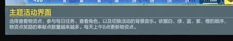 2、在主题活动界面,战士们可以参与每日活动、查看角色,以及切换活动的背景音乐。依据白、绿、蓝、紫、橙的顺序,物资点奖励的奉献点数量越来越多。每天上午8点更新物资点。