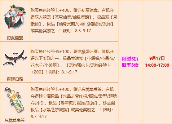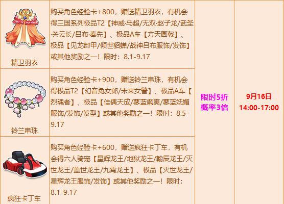9月15日-9月17日,每日多款人气宝箱优惠来袭,限时5折福利,更有3倍概率助你赢取三国系列极品T2【神威·马超/无双·赵子龙/武圣·关云长/吕布·奉先】、极品T2【幻音兔女郎/未来女警】、极品A车【方天画戟】 、极品双人骑宠【苍穹仙灵/仙缘灵鹤】等其他极品奖励,惊喜不容错过!