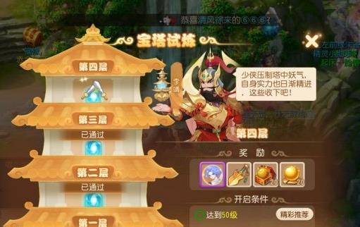 第四层则需要玩家到达50级后才可以参与试炼,已经通关的关卡不可重复挑战。