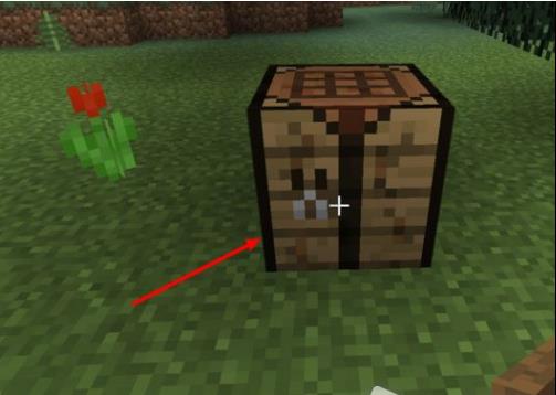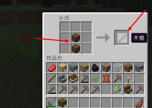 3.右键打开工作台,用2个木板按图中排列放进去获得木棍。