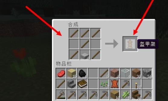 8.最后一步,把之前获得的木棍和石台阶再按图中放进工作台,就可以做出盔甲架了。