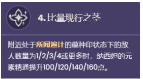 附近处于所闻遍计的蕴种印状态下的敌人数量为1/2/3/4或更多时,纳西妲的元素精通提升100/120/140/160点。