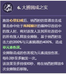 施放心景幻成后,纳西妲的普通攻击或重击命中处于所闻遍计的蕴种印连结中的敌人时,将对该敌人及其所处连结中的所有敌人释放业障除,基于纳西妲攻击力的200%与元素精通的400%,造成草元素伤害。