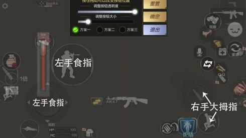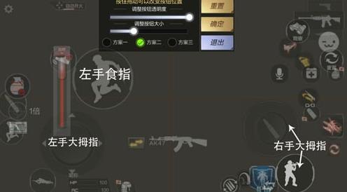 因为小编之前是和平精英的五指选手,所以对秒蹲情有独钟,秒蹲在FPS类游戏中躲避爆头线是非常有用的,因此多加了一根左手食指来控制蹲键,这个蹲键可以按照自己的操作习惯来进行大小缩放和位置移动。这里再讲一下为什么不像和平精英传统三指那样用左手食指来控制开火键,因为CF手游用点射的情况更多(AK远点),用右手大拇指可以有更快的手速以及更舒适的点击体验,而左手食指单点容易划动屏幕,点起来不方便。